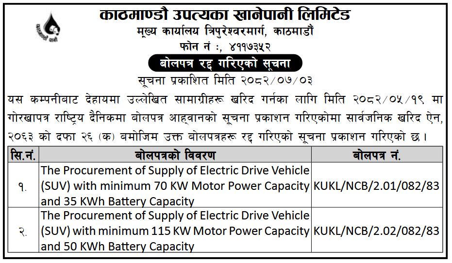 बोलपत्र रद्द गरिएको सूचना – मुख्य कार्यालय – २०८२-०७-०३