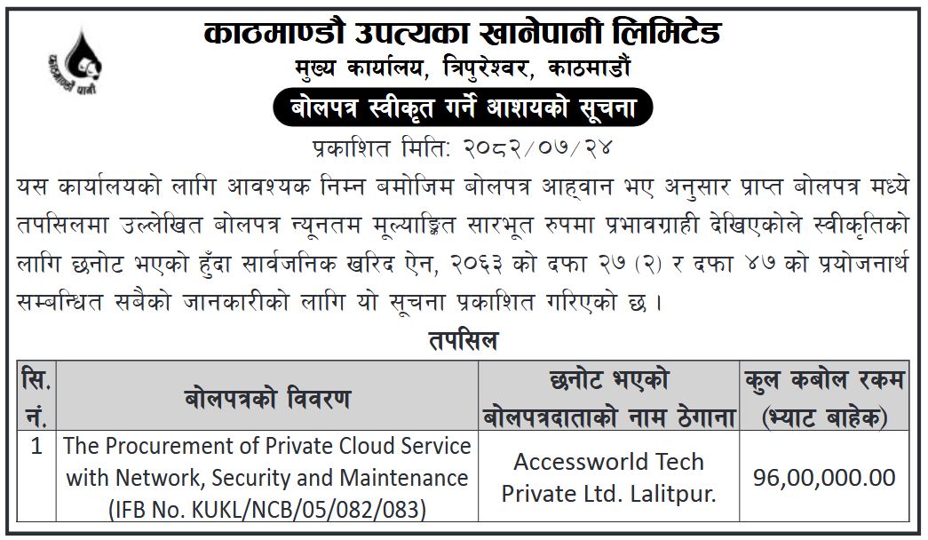 बोलपत्र स्वीकृत गर्ने आशयको सूचना सूचना – मुख्य कार्यालय – २०८२-०१-०८