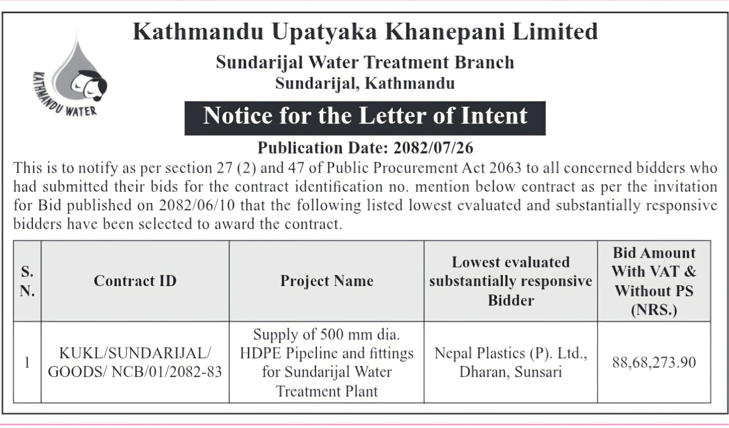 Notice for the Letter of Intent – Sundarijal Water Treatment Branch – 2082-02-16