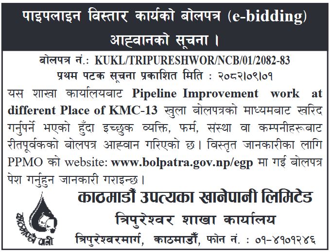 पाईपलाईन विस्तार कार्यको बोलपत्र (e-bidding) आह्वानको सूचना – त्रिपुरेश्वर शाखा – २०८२-०९-०१